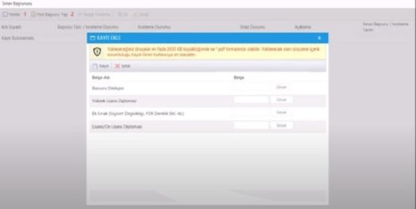 Sınav başvurusu kapsamında sizden talep edilen belgeleri yüklemeniz kritik önem taşımaktadır. Bu bağlamda sınava gireceğiniz sınıfı belirledikten sonra sistem üzerinde bir belge yükleme alanı açılacaktır. Başvuru için gerekli olan belgeleri bu sisteme PDF dosyası olarak eklemeniz mümkündür.
