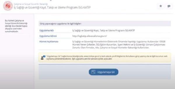 İş Sağlığı ve Güvenliği Kayıt, Takip ve İzleme Programı olan İSG Katip için size verilen adımları izlemeniz yeterlidir. e-devlet sistemi üzerinden giriş yaptıktan sonra “Uygulamaya Git” seçeneğine tıklayarak İSG Katip sayfasına giriş yapabilirsiniz.