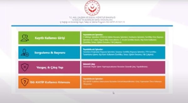 “Sorgulama &;; Başvuru” sekmesine tıkladıktan sonra karşınıza bu sayfa çıkar. Bu kısımda yapacağınız işlemi seçerek kayıtlı kullanıcı girişi yapmanız gerekmektedir. İSG sınavı için başvuruda bulunacak olan kişiler “İş Güvenliği Uzmanlığı İşlemleri” seçeneğini tercih etmelidir.