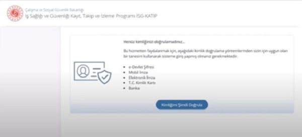 e-devlet sistemine T.C. kimlik numaranız ve şifreniz ile giriş yaparak İSG Katip Uygulaması’na ulaşabilirsiniz. “Kimliğimi Şimdi Doğrula” sekmesine tıklayarak bilgilerinizi onaylatabilir ve sisteme girebilirsiniz.